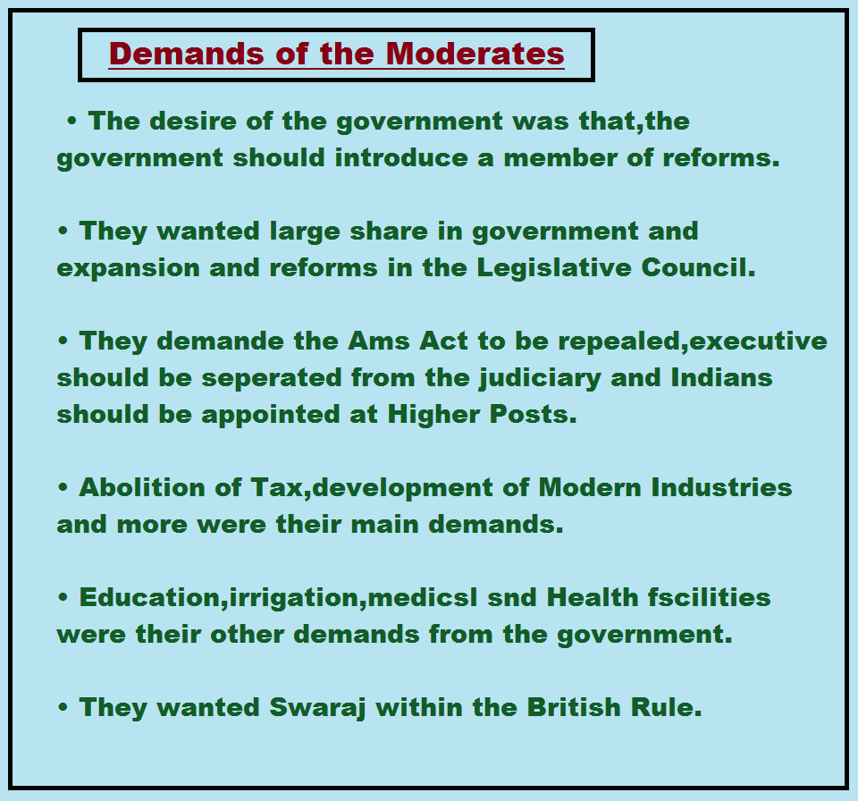 `color{green} ✍️` Between 1885 and 1905, the Congress leaders were moderates. The Moderates had faith in the British justice and goodwill. They were called moderates because they adopted peaceful and constitutional means to achieve their demands.