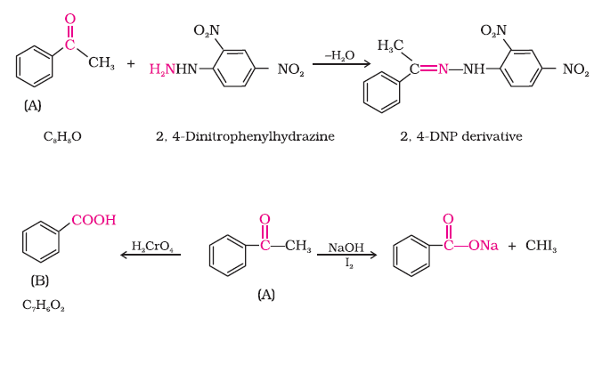 An organic compound (A) with molecular formula `C_8H_8O` forms an orange-red precipitate with 2,4-DNP reagent and gives yellow precipitate on heating with iodine in the presence of sodium hydroxide. It neither reduces Tollens’ or Fehlings’ reagent, nor does it decolourise bromine water or Baeyer’s reagent. On drastic oxidation with chromic acid, it gives a carboxylic acid (B) having molecular formula `C_7H_6O_2`. Identify the compounds (A) and (B) and explain the reactions involved.