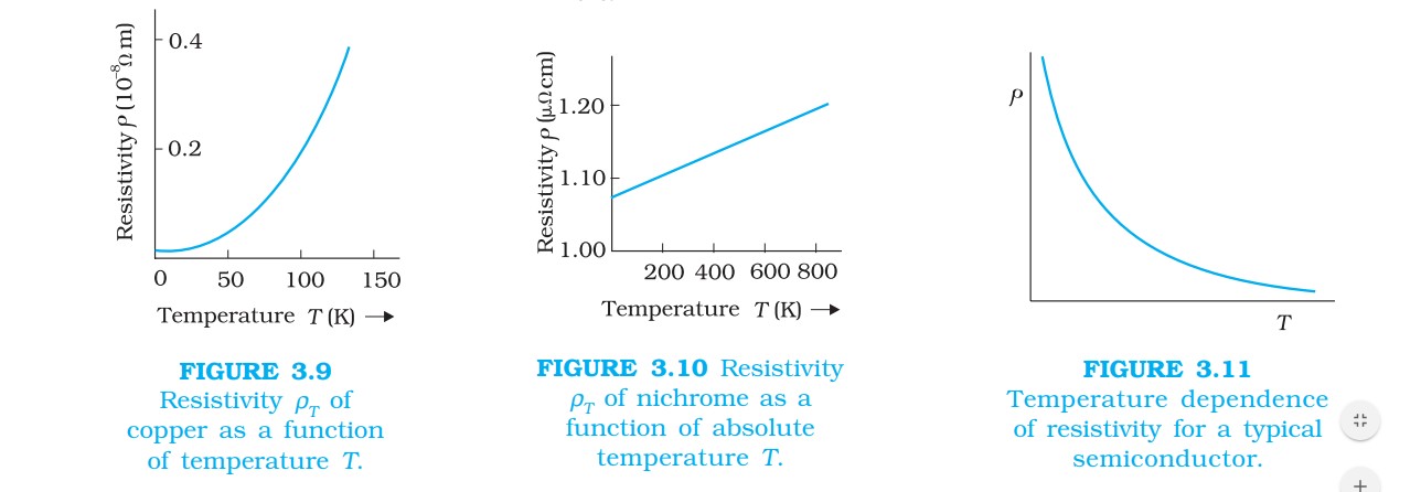`color{blue} ✍️` `ρ` thus depends inversely both on the number n of free electrons per unit volume and on the average time `τ` between collisions. As we increase temperature, average speed of the electrons, which act as the carriers of current, increases resulting in more frequent collisions. The average time of collisions `τ`, thus decreases with temperature.