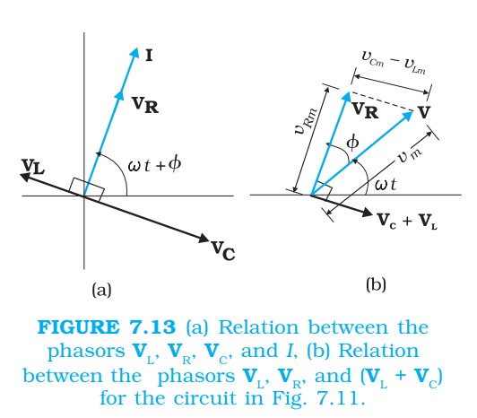 `color {blue}{➢➢}`Since `V_C` and `V_L` are always along the same line and in opposite directions, they can be combined into a single phasor `color{green}((V_C + V_L))` which has a magnitude `color{green}(|v_(Cm) – v_(Lm)|)`.