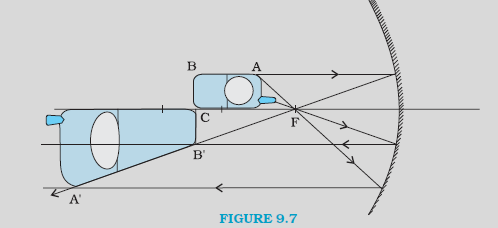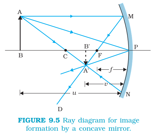 Figure 9.5 shows the ray diagram considering three rays. It shows the image `A′B′` (in this case, real) of an object `AB` formed by a concave mirror. It does not mean that only three rays emanate from the point `A`.
