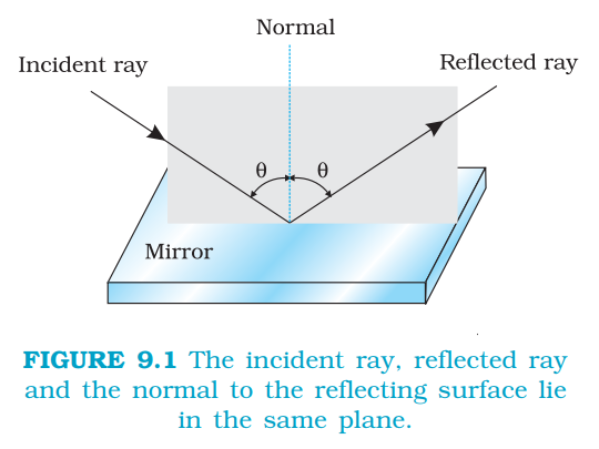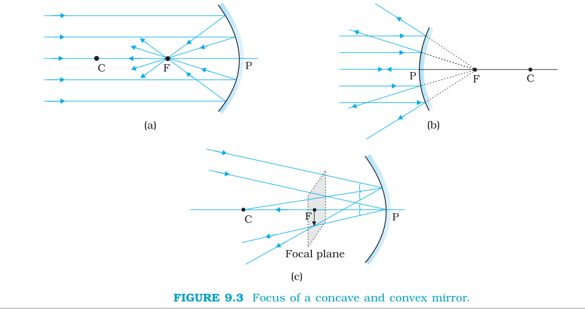 `color{blue}{(iii)}` The ray passing through (or directed towards) the focus of the concave mirror or appearing to pass through (or directed towards) the focus of a convex mirror. The reflected ray is parallel to the principal axis.