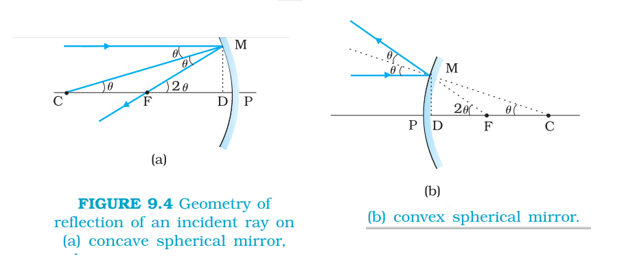 `color{blue} {(iv)}` The ray incident at any angle at the pole. The reflected ray follows laws of reflection.
