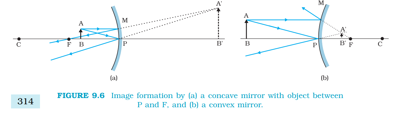 `color {blue}{➢➢}`Figure 9.6 shows the ray diagrams for virtual image formed by a concave and convex mirror. You should verify that Eqs. (9.7) and (9.9) are valid for these cases as well.