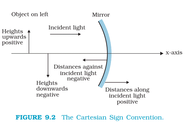 Equation (9.6) is a relation involving magnitude of distances. We now apply the sign convention. We note that light travels from the object to the mirror MPN. Hence this is taken as the positive direction.