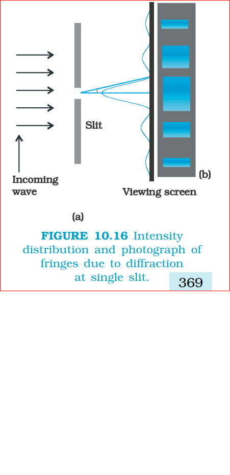 `color{blue} ✍️`When the double slit in Young’s experiment is replaced by a single narrow slit (illuminated by a monochromatic source), a broad pattern with a central bright region is seen. On both sides, there are alternate dark and bright regions, the intensity becoming weaker away from the centre (Fig. 10.16).