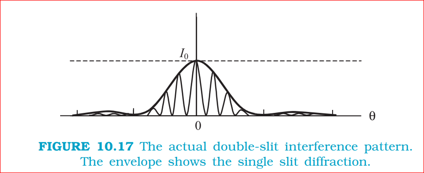 `color{blue} ✍️`In the double-slit experiment, we must note that the pattern on the screen is actually a superposition of single-slit diffraction from each slit or hole, and the double-slit interference pattern. This is shown in Fig. 10.17.