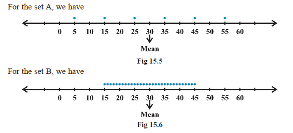 If `color{navy}(sum_(i=1)^(n) (x_i-barx)^2)` is simply our measure of dispersion or scatter about mean, we will tend to say that the set `A` of six observations has a lesser dispersion about the mean than the set `B` of `31` observations, even though the observations in set `A` are more scattered from the mean (the range of deviations being from `–25` to `25`) than in the set `B` (where the range of deviations is from `–15` to `15`).
