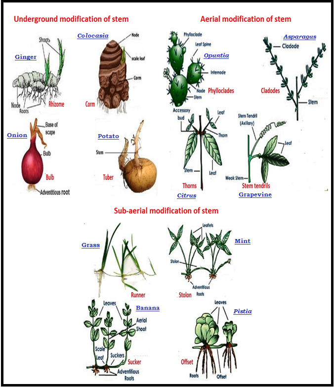 `star` The stems bear `color{Violet}"nodes and internodes"`. The region of the stem where `color{Violet}"leaves are born"` are called nodes while internodes are the `color{Violet}"portions between two nodes"`.