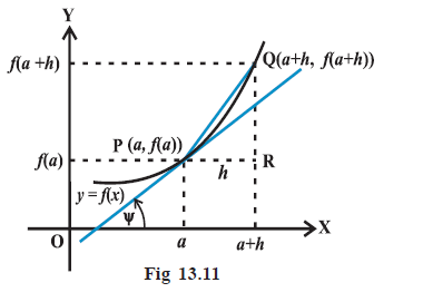 We now present a geometric interpretation of derivative of a function at a point. Let `y = f(x)` be a function and let `P = (a, f(a))` and `Q = (a + h, f(a + h)` be two points close to each other on the graph of this function. The Fig 13.11 is now self explanatory.