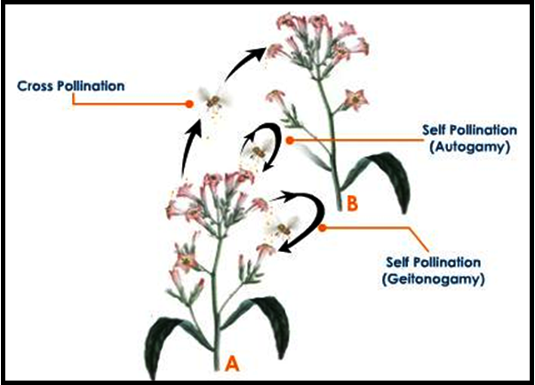 ● Autogamy in such flowers requires `color{Violet}"synchrony"` in pollen `color{Violet}"release"` and stigma `color{Violet}"receptivity"` and also, the anthers and the stigma should lie `color{Violet}"close to each other"` so that self-pollination can occur.