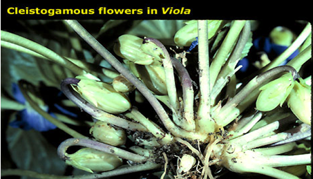 ● Thus, cleistogamous flowers are `color{Violet}"invariably autogamous"` as there is no chance of cross-pollen landing on the stigma.