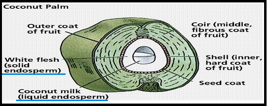 ● The `color{Violet}"coconut water"` from tender coconut that you are familiar with, is nothing but `color{Violet}"free-nuclear endosperm"` (made up of thousands of nuclei) and the surrounding `color{Violet}"white kernel"` is the `color{Violet}"cellular endosperm"`.