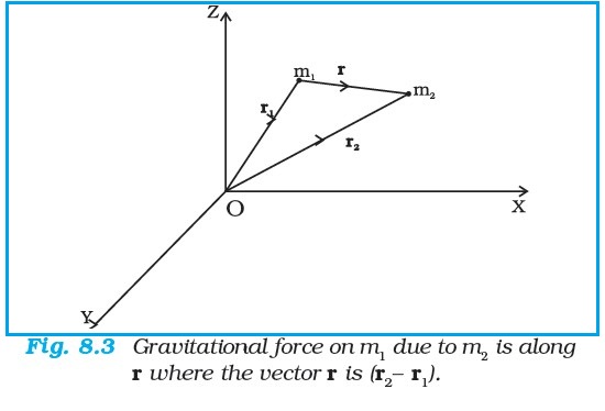 `=>` where `G` is the universal gravitational constant, `hat r` is the unit vector from `m_1` to `m_2` and `r=r_2-r_1` as shown in Fig. 8.3.
