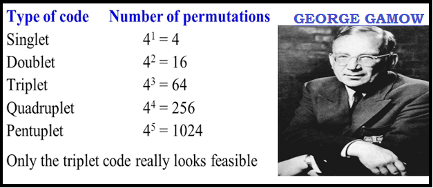 ● This was a very bold proposition, because a `color{violet}"permutation combination"` of `4^3` (4 × 4 × 4) would generate `color{violet}"64 codons"`; generating many more codons than required.