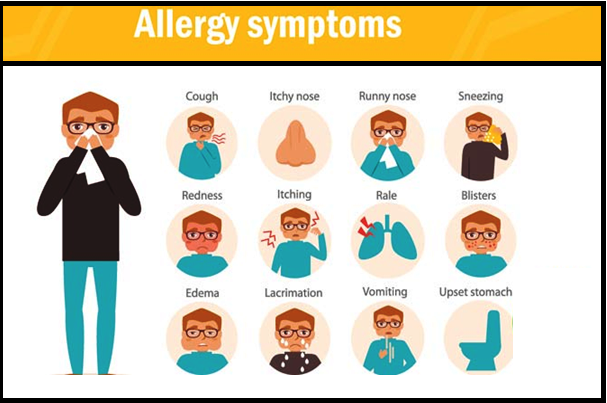 ● Symptoms of allergic reactions include `color{Violet}"sneezing"`, `color{Violet}"watery eyes"`, `color{Violet}"running nose"` and `color{Violet}"difficulty in breathing"`.