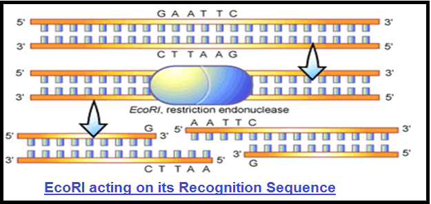 ● This `color{Violet}"specific base sequence"` is known as the `color{Brown}"recognition sequence"` for Hind II.