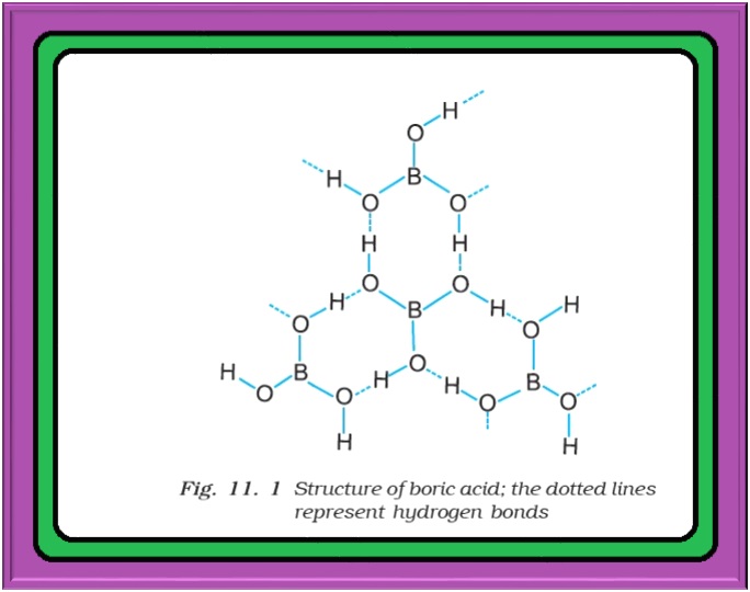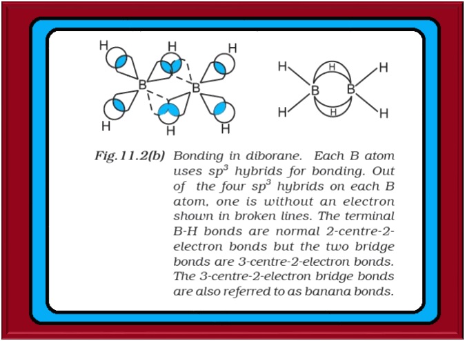 The four terminal hydrogen atoms and the two boron atoms lie in one plane. Above and below this plane, there are two bridging hydrogen atoms. The four terminal `color{red}(B-H)` bonds are regular two centre-two electron bonds while the two bridge `color{red}((B-H-B))` bonds are different and can be described in terms of three centre–two electron bonds shown in Fig.11.2 (b).