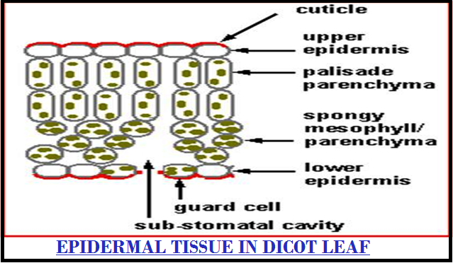 ● The outside of the `color{violet}("epidermis")` is often covered with a waxy thick layer called the `color{brown}("cuticle")` which prevents the `color{violet}("loss of water.")`