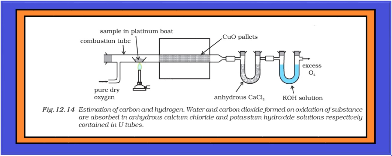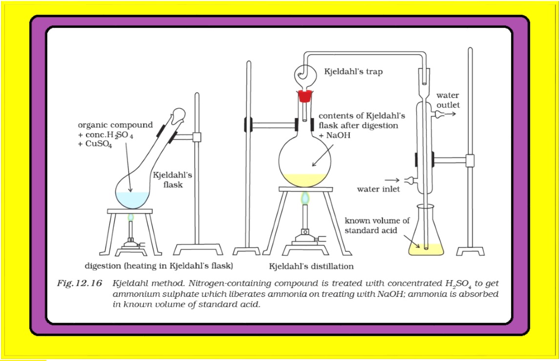 (ii) Kjeldahl’s method: The compound containing nitrogen is heated with concentrated sulphuric acid. Nitrogen in the compound gets converted to ammonium sulphate (Fig. 12.16). The resulting acid mixture is then heated with excess of sodium hydroxide. The liberated ammonia gas is absorbed in an excess of standard solution of sulphuric acid. The amount of ammonia produced is determined by estimating the amount of sulphuric acid consumed in the reaction. It is done by estimating unreacted sulphuric acid left after the absorption of ammonia by titrating it with standard alkali solution. The difference between the initial amount of acid taken and that left after the reaction gives the amount of acid reacted with ammonia.