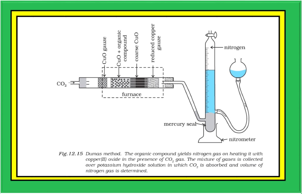 (i) Dumas method: The nitrogen containing organic compound, when heated with copper oxide in an atmosphere of carbon dioxide, yields free nitrogen in addition to carbon dioxide and water.