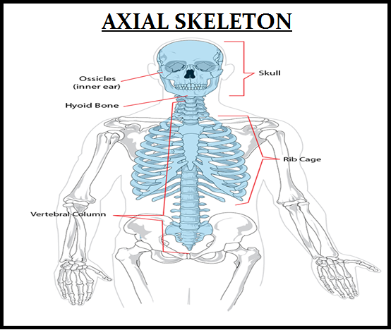 ● The `color{brown}("skull, vertebral column, sternum")` and `color{brown}("ribs")` constitute `color{violet}("axial skeleton.")`