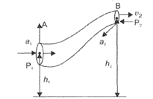 Consider an incompressible non-viscous liquid entering the cross-section `A_1` at A with a velocity `v_1` and coming a height `h_2` at B with velocity `v_2`