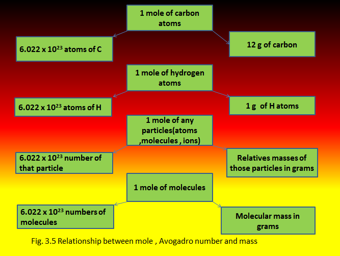 `color{green}(β’)` The mass of 1 mole of a substance is equal to its relative atomic or molecular mass in grams. The atomic mass of an element gives us the mass of one atom of that element in atomic mass units `color{red}((u))`.