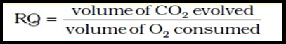 ● The `color{violet}"ratio of the volume"` of `CO_2` evolved to the volume of `O_2` consumed in `color{violet}"respiration"` is called the `color{Brown}"respiratory quotient"` `color{violet}"(RQ)"` or `color{Brown}"respiratory ratio"`.