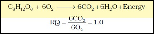 ● When `color{violet}"carbohydrates are used as substrate"` and are `color{violet}"completely oxidised"`, the `color{Brown}"RQ will be 1"`, because `color{violet}"equal amounts"` of `CO_2` and `_O`2 are evolved and consumed, respectively, as shown in the `color{violet}"equation below"` :