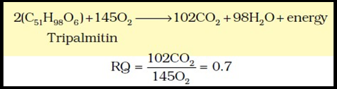 ● When `color{violet}"fats are used"` in respiration, the `color{Brown}"RQ is less than 1"`.