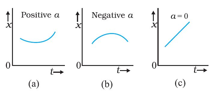 Position-time graphs for motion with positive, negative and zero acceleration are shown in Figs. (a), (b) and (c), respectively.