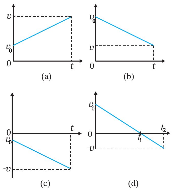 `(d)` An object is moving in positive direction till time `t_1`, and then turns back with the same negative acceleration.