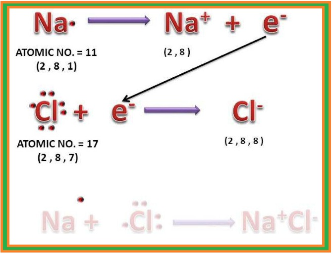 ● In the case of sodium and chlorine, this can happen by the transfer of an electron from sodium to chlorine thereby giving the `Na^+` and `Cl^–` ions.