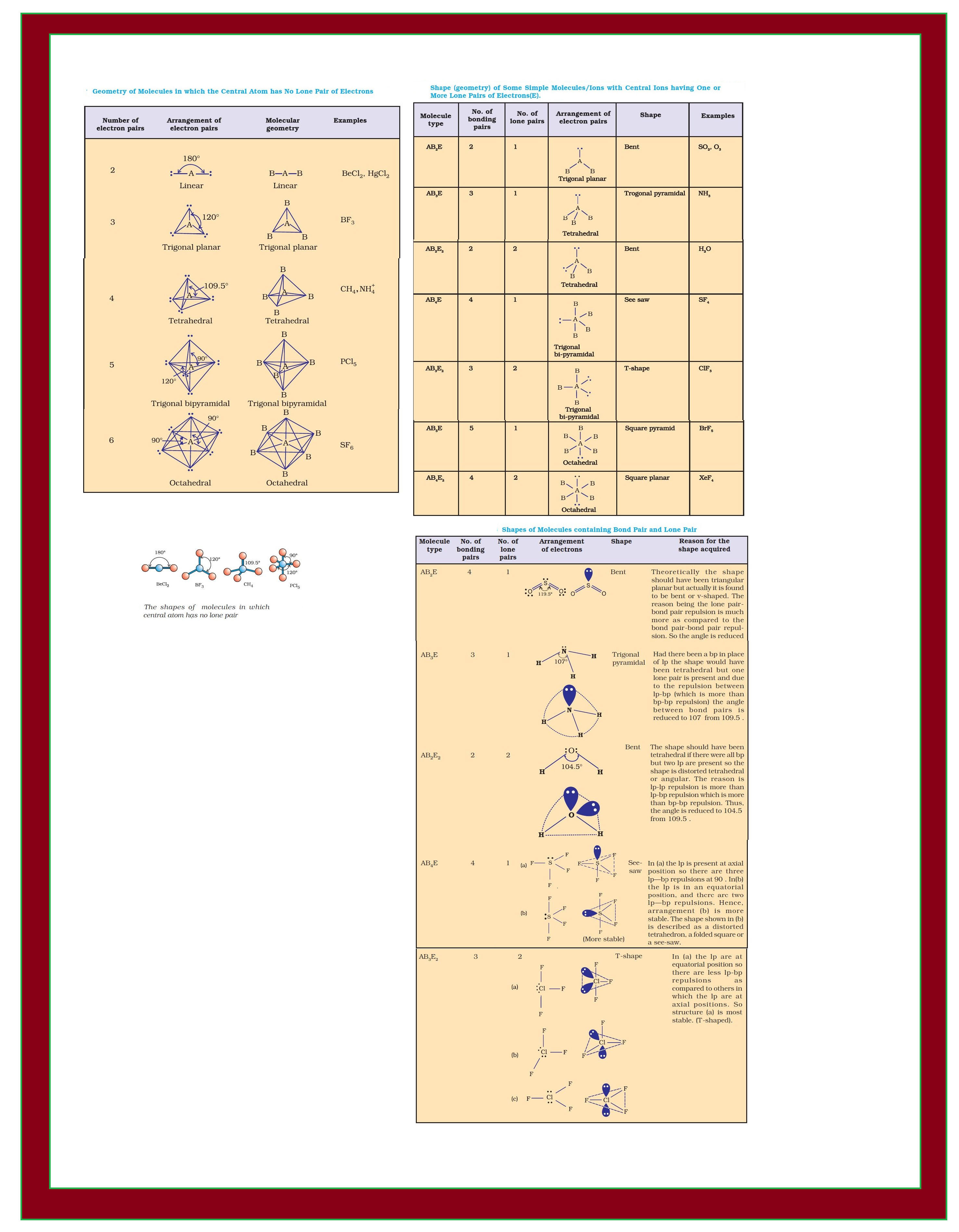 `=>` Table shows shapes of some simple molecules and ions in which the central atom has one or more lone pairs.