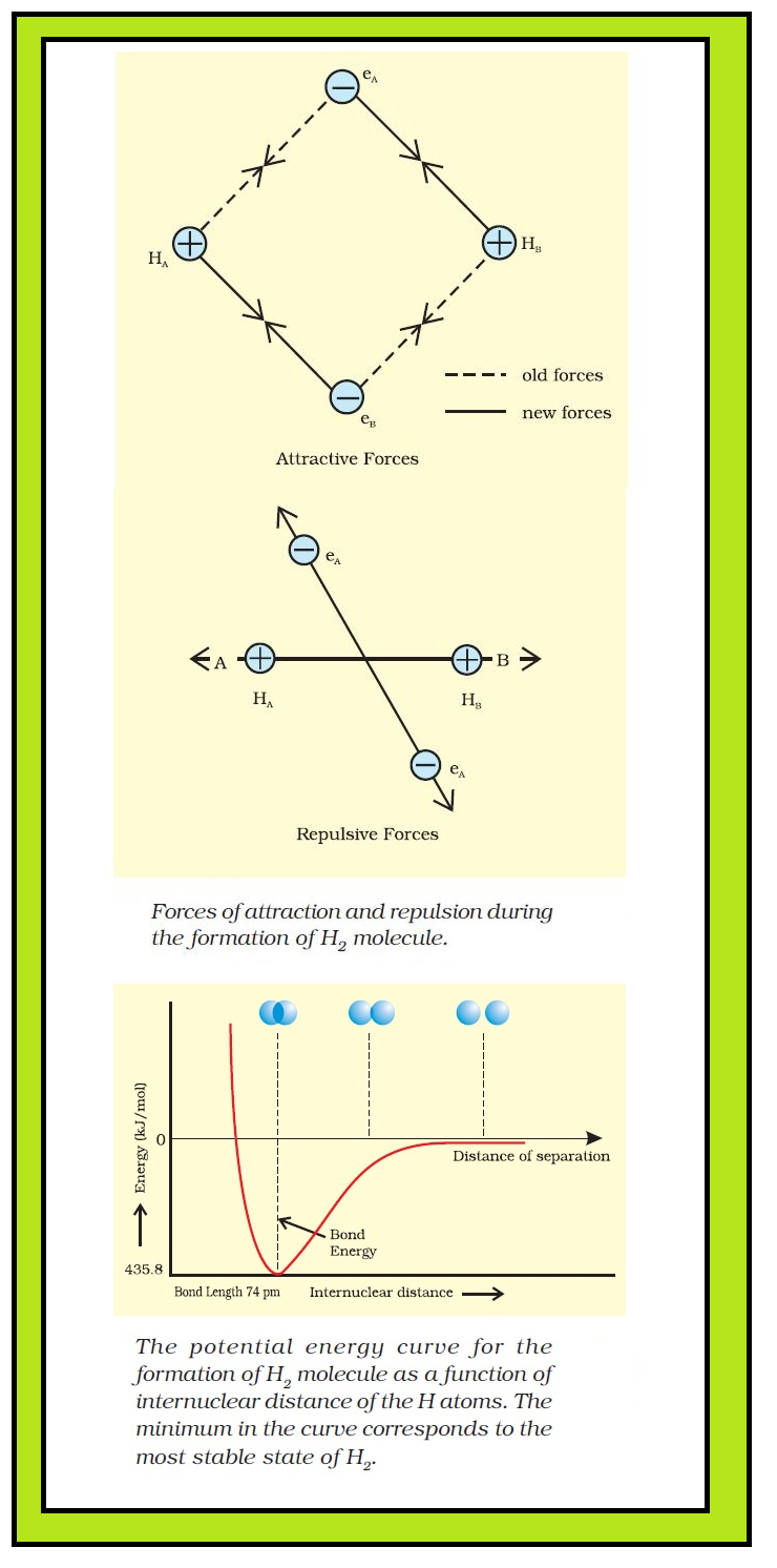 ● As a result, two atoms approach each other and potential energy decreases and a stage is reached where the net force of attraction balances the force of repulsion and system acquires minimum energy.