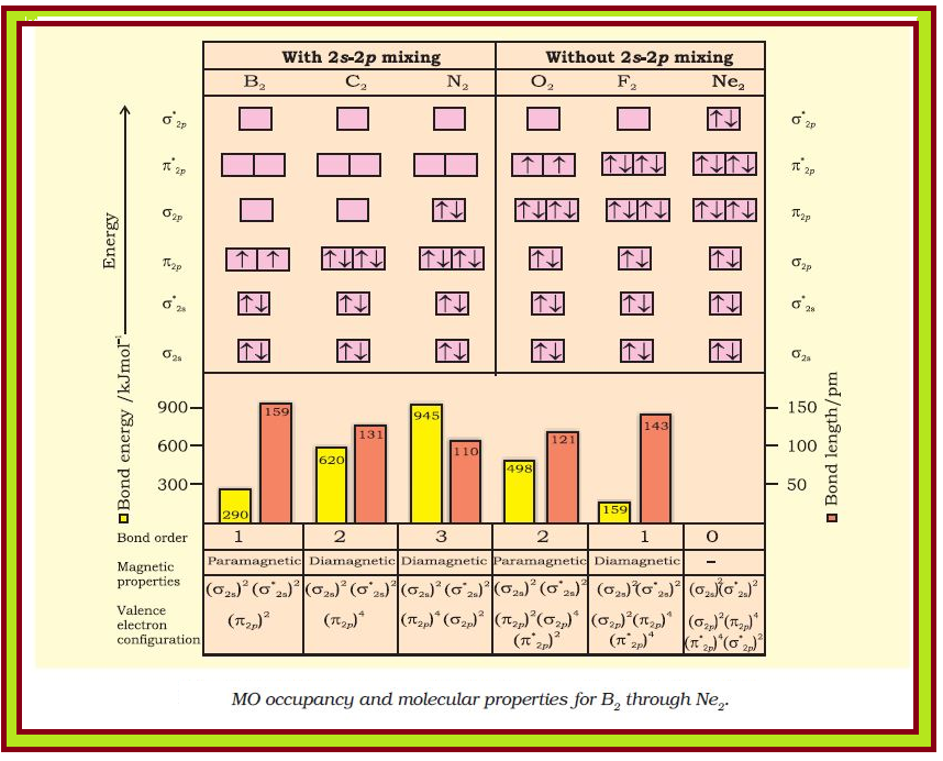 `=>` In Fig.4.21 are given the molecular orbital occupancy and molecular properties for `B_2` through `Ne_2`.