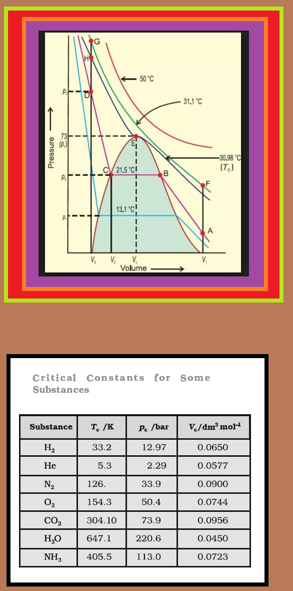 ● At `30.98 °C` carbon dioxide remains gas up to `73` atmospheric pressure. (Point `E` in Fig.). At `73` atmospheric pressure, liquid carbon dioxide appears for the first time. The temperature `30.98 °C` is called `text(critical temperature)` (`T_C`) of carbon dioxide. This is the highest temperature at which liquid carbon dioxide is observed. Above this temperature it is gas. Volume of one mole of the gas at critical temperature is called `text(critical volume)` (`V_C`) and pressure at this temperature is called `text(critical pressure)` (`p_C`). The critical temperature, pressure and volume are called critical constants.