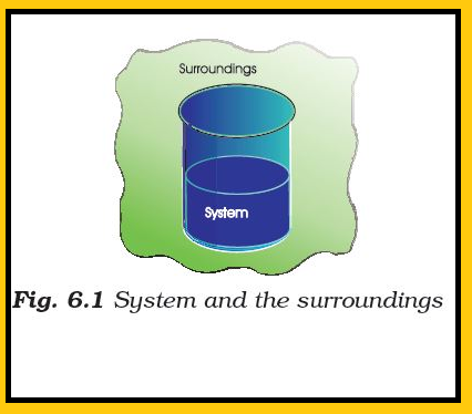 ● `text(Example :)` If we are studying the reaction between two substances `A` and `B` kept in a beaker, the beaker containing the reaction mixture is the system and the room where the beaker is kept is the surroundings (Fig. 6.1).