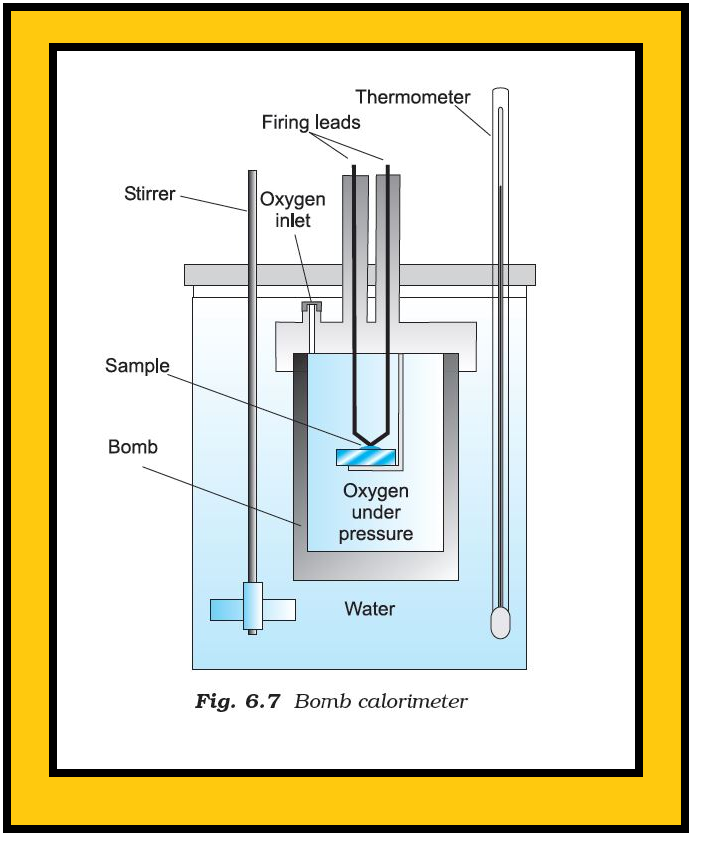 `=>` For chemical reactions, heat absorbed at constant volume, is measured in a `color{red}("bomb calorimeter")` (Fig. 6.7).