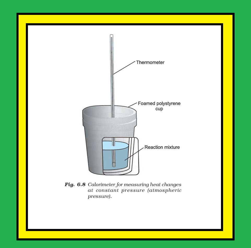 `=>` Measurement of heat change at constant pressure (generally under atmospheric pressure) can be done in a calorimeter shown in Fig.6.8.