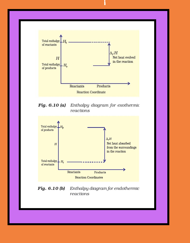 `=>` The decrease in enthalpy in passing from reactants to products may be shown for any exothermic reaction on an enthalpy diagram as shown in Fig. 6.10(a).