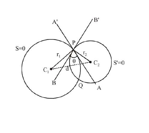 If the angle between the circles is `90^(circ)`, i.e., `theta = 90^(circ)`, then the circles are said to be orthogonal circles or we say that the circles cut each other ORTHOGONALLY.