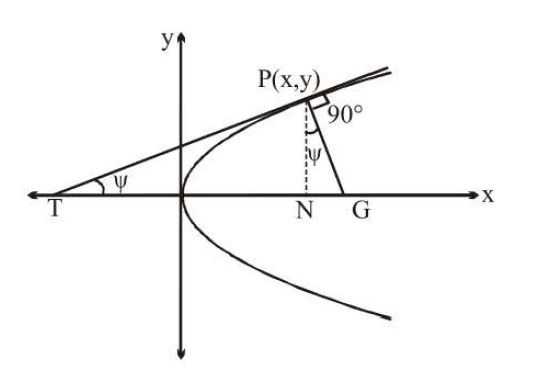 Let the parabola is `y^2 = 4ax` . Let the tangent at any point `P(x, y)` meet the axis of parabola at `T` and `G` respectively and tangent makes an angle `psi ` with `x`-axis.