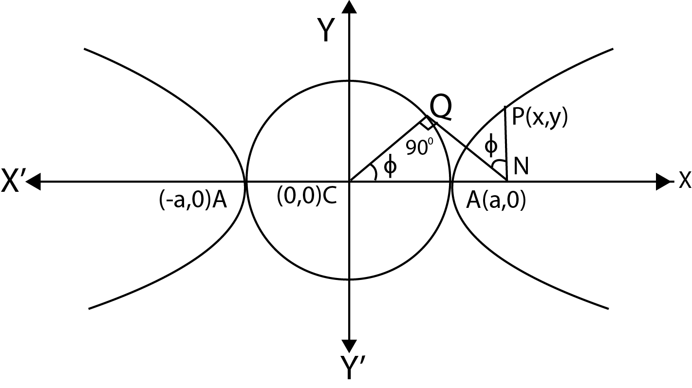 then `P` and `Q` are the corresponding points of the hyperbola and the auxiliary circle. Here `phi` is the eccentric angle of `P. ` `(0 le phi < 2 pi)`.