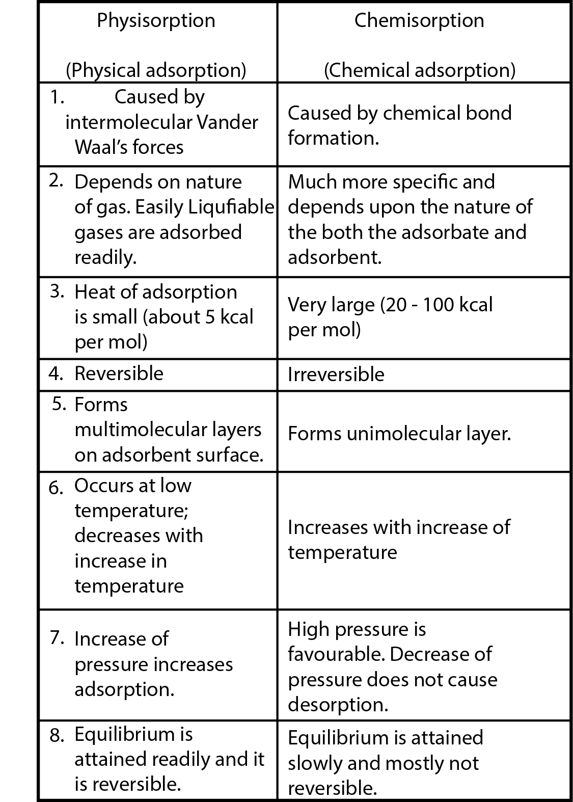 The adsorption of one substance on the surface of another leads to the existence of new types of forces between them. Therefore, it is an exothermic process and is accompanied by the release of energy. The enthalpy or heat of adsorption is defined as the heat energy evolved when one mole of adsorbate is adsorbed on the surface of adsorbent. Since physical adsorption involves weak forces of attraction between the molecules of the adsorbent and the adsorbate, the heat of physisorption is generally low, of the order of `20 - 40` `kJ mol ^(- 1)`. Chemical adsorption, on the other hand involves strong chemical bond formation and the heat of chemisorption is quite high, of the order of `80 - 400` `kJ mol^(-1)` .
