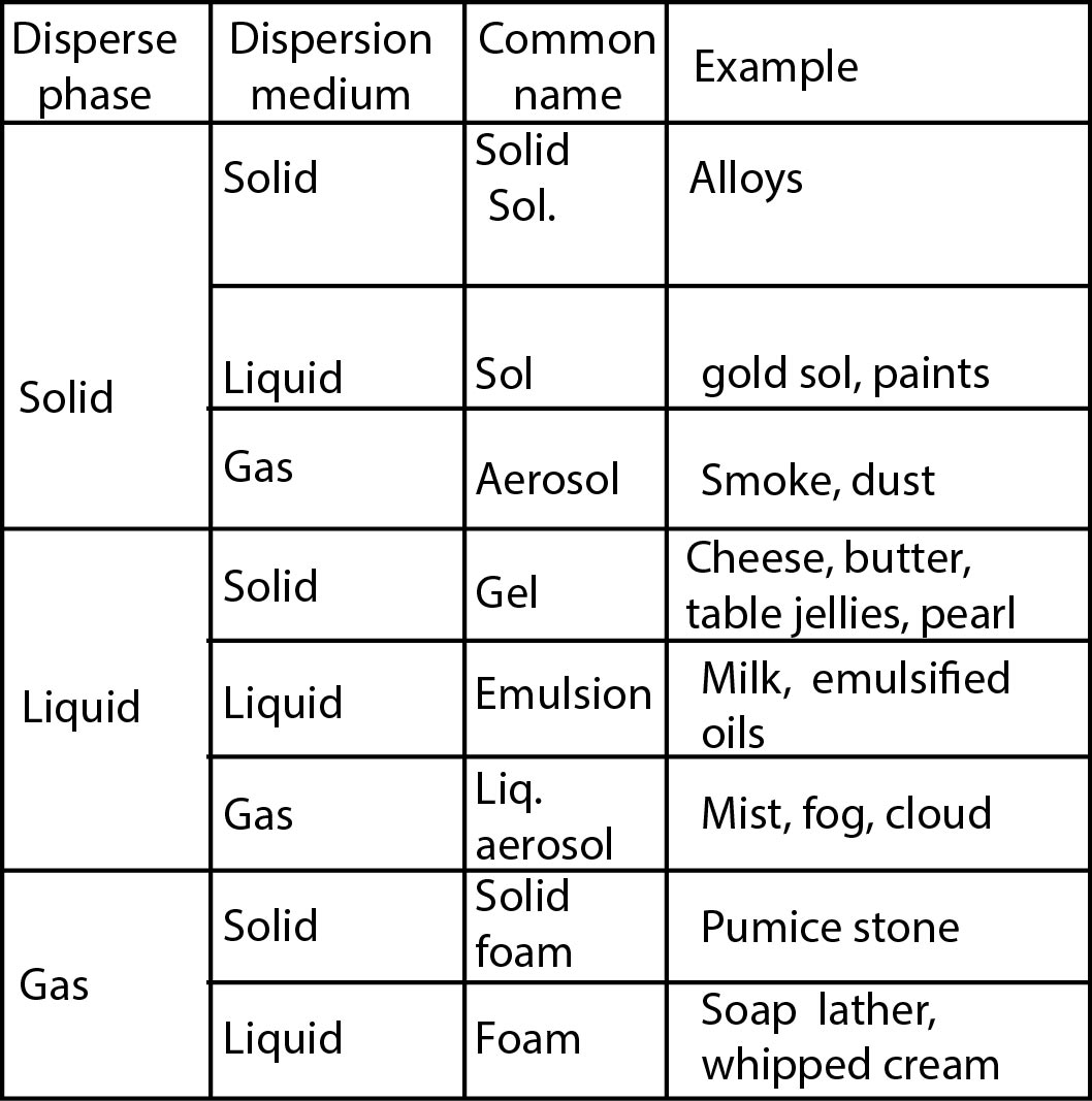 Thomas Graham tried to classify solids into (i) crystalloids and (ii) colloids based on the diffusion of dissolved solids through parchment paper or animal membrane. Substances like common salt, urea, sugar etc., which readily pass through the membrane while in the dissolved state were called crystalloids while substances like starch, gelatin, gum Arabic etc. which in the dissolved state either do not pass through the membrane or pass through very slowly were called colloids. This classification was rejected because the same substance under one set of conditions behaved like a crystalloid and under other set of conditions behaved like a colloid. For example, `NaCl` in water behaves like a crystalloid but in benzene behaves like a colloid. Soap in water behaves like a colloid while in alcohol it behaves, like a crystalloid. Therefore, there is no separate class of substances called colloidal substance. It is just a state of matter into which every substance can be obtained by a suitable method. The nature of a substance whether crystalloid or colloid depends upon the size of the solute particles. When the size of solute particles lies between `1 nm` to `100 nm` it behaves like a colloid. If size of solute particles is greater than `100 nm`, it exists as suspension and if particle size is less than `1 nm` it exists as a true solution. Colloidal solution is heterogeneous in nature and always consists of at least two phases - namely disperse phase and dispersion medium. The component present in small proportion and consisting of particles of colloidal dimensions is called disperse phase. The medium in which colloidal particles are dispersed is called dispersion medium. The two phases can be solid- liquid or -gas. There are eight different types of colloidal solutions.