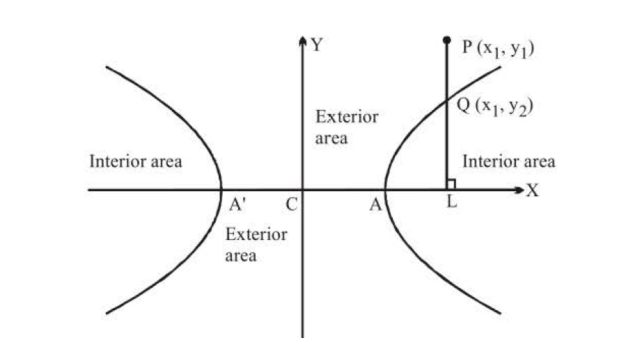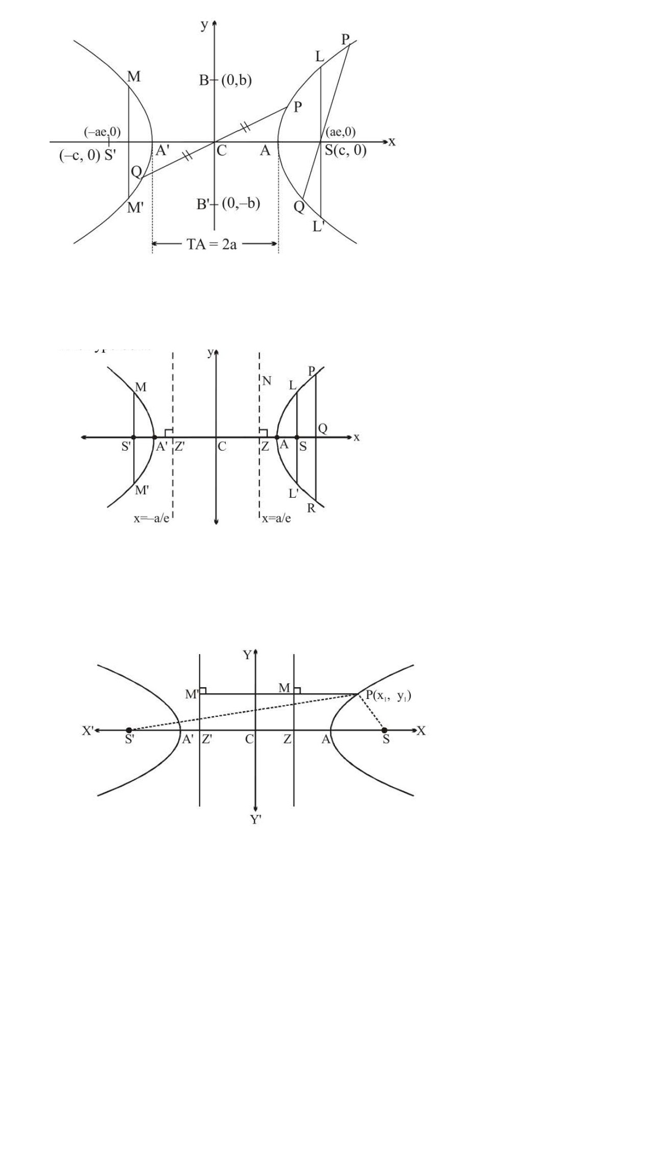 `S(a e, 0)` and `S'(- a e, 0)` are two foci of hyperbola. Line containing the fixed points `S` and `S'` (called Foci) is called Transverse Axis `(TA)` or Focal Axis and the distance between `S` and `S'` is called Focal Length.