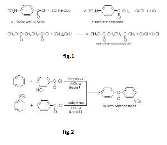 This low reactivity of organocopper compounds is useful in the light that it do not react with the functional groups with which organomagnesium and organolithium reagents react. Thus, the presence of some functional groups (like `- NO_2, - CN, - CO - , -CO_2R` etc.) does not interfere with the synthesis of ketones.