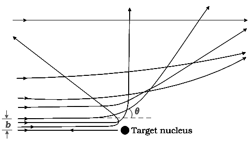 A typical graph of the total number of `α-` particles scattered at different angles, in a given interval of time, is shown in Fig-b . The dots in this figure represent the data points and the solid curve is the theoretical prediction based on the assumption that the target atom has a small, dense, positively charged nucleus. Many of the α-particles pass through the foil. It means that they do not suffer any collisions. Only about `0.14%` of the incident α-particles scatter by more than `1^@`, and about `1` in `8000` deflect by more than `90^@`. Rutherford argued that, to deflect the `α-` particle backwards, it must experience a large repulsive force. This force could be provided if the greater part of the mass of the atom and its positive charge were concentrated tightly at its centre. Then the incoming α-particle could get very close to the positive charge without penetrating it, and such a close encounter would result in a large deflection. This agreement supported the hypothesis of the nuclear atom. This is why Rutherford is credited with the discovery of the nucleus. In Rutherford's nuclear model of the atom, the entire positive charge and most of the mass of the atom are concentrated in the nucleus with the electrons some distance away. The electrons would be moving in orbits about the nucleus just as the planets do around the sun. Rutherford's experiments suggested the size of the nucleus to be about `10^(-15)` m to `10^(-14)` m. From kinetic theory, the size of an atom was known to be `10^(-10)` m, about 10,000 to 100,000 times larger than the size of the nucleus. Thus, the electrons would seem to be at a distance from the nucleus of about 10,000 to 100,000 times the size of the nucleus itself. Thus, most of an atom is empty space. With the atom being largely empty space, it is easy to see why most `α`-particles go right through a thin metal foil. However, when α-particle happens to come near a nucleus, the intense electric field there scatters it through a large angle. The atomic electrons, being so light, do not appreciably affect the `α`-particles. The scattering data shown in Fig-c can be analysed by employing Rutherford's nuclear model of the atom. As the gold foil is very thin, it can be assumed that `α`-particles will suffer not more than one scattering during their passage through it. Therefore, computation of the trajectory of an alpha-particle scattered by a single nucleus is enough. Alpha particles are nuclei of helium atoms and, therefore, carry two units, 2e, of positive charge and have the mass of the helium atom. The charge of the gold nucleus is `Ze`, where `Z` is the atomic number of the atom; for gold `Z = 79`. Since the nucleus of gold is about `50` times heavier than an α-particle, it is reasonable to assume that it remains stationary throughout the scattering process. Under these assumptions, the